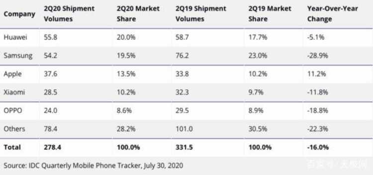 全球市场亦是如日中天,IDC数据显示,2020年Q2季度,华为以5580万部的出货量排在全球第一,占当期市场份额的20%。
