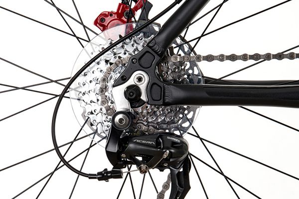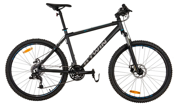 前齿盘有三个,带动车轮运转的后齿盘有数量不等的几个盘。以我个人购买的迪卡侬RR520入门级山地车为例,它拥有前三后九共27种搭配方案,俗称27速。前齿盘越大,后齿盘越小,脚蹬越费力。这是因为前轮转一圈,后轮转的圈数更多。前齿盘越小,后齿盘越大,脚蹬时越轻松,这是因为后轮运转时需要的能量,被前轮分摊了。