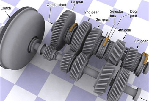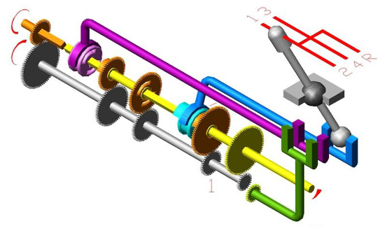 我们在结构示意图上可以看到Selector fork,俗称换挡拨叉。每两个齿轮之间设置一个,它的作用是锁死齿轮,让齿轮与输出轴之间形成硬连接,将输入轴的能量传递给车轮。我们能看到它在1档和2档之间、3档和4档之间以及5档都存在,这也就是我们常见的,向上推为1档,向下为2档的操作方法。