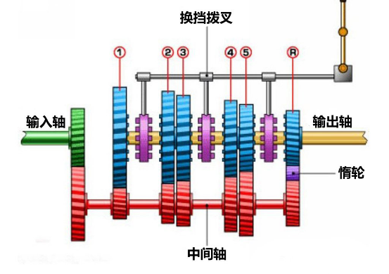 只要你理解自行车的变速系统,理解手动变速箱结构就十分简单了。手动变速箱内部其实也是由多个齿轮组成,只不过他们不通过链条连接,而是通过咬合的方式连接在一起。我们先看一下常见的5速手动变速箱结构示意图。
