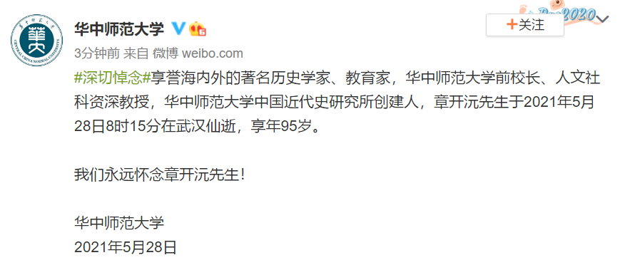 据@华中师范大学 微博消息,享誉海内外的著名历史学家、教育家,华中师范大学前校长、人文社科资深教授,华中师范大学中国近代史研究所创建人,章开沅先生于2021年5月28日8时15分在武汉逝世,享年95岁。