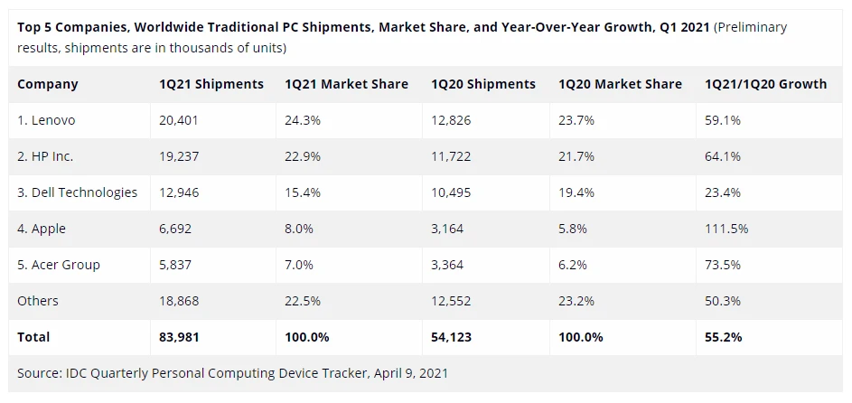 根据财报,2020/21财年,联想的个人电脑和智能设备业务实现营收485亿美元,同比增长22%。市场研究机构IDC的研究数据显示,2021年一季度,联想以2040.1万台的PC出货量,24.3%的市场份额在全球品牌中蝉联第一。