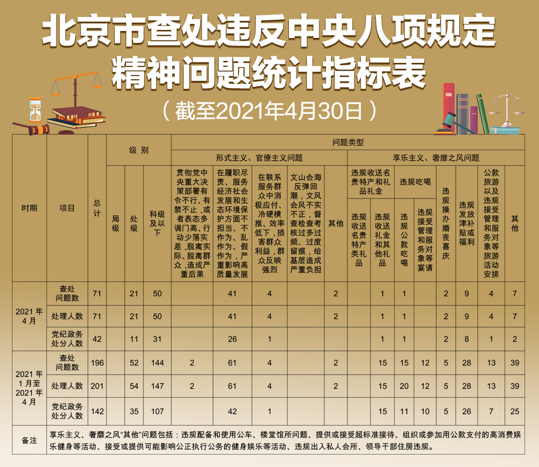 据“清风北京”微信公众号消息,日前,北京市纪委监委公布今年1月至4月查处违反中央八项规定精神问题统计指标表。截至4月30日,本市累计查处违反中央八项规定精神问题196起,处理201人,其中处级54人、科级及以下147人。