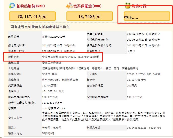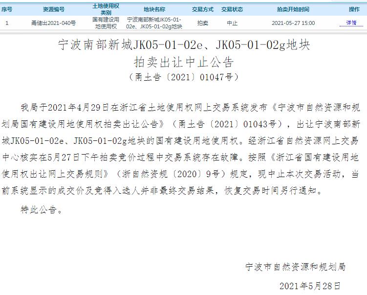 我局于2021年4月29日在浙江省土地使用权网上交易系统发布《宁波市自然资源和规划局国有建设用地使用权拍卖出让公告》(甬土告〔2021〕01043号),出让宁波南部新城JK05-01-02e、JK05-01-02g地块的国有建设用地使用权。经浙江省自然资源网上交易中心核实在5月27日下午拍卖竞价过程中交易系统存在故障。按照《浙江省国有建设用地使用权出让网上交易规则》(浙自然资规〔2020〕9号)规定,现中止本次交易活动,当前系统显示的成交价及竞得入选人并非最终交易结果,恢复交易时间另行通知。