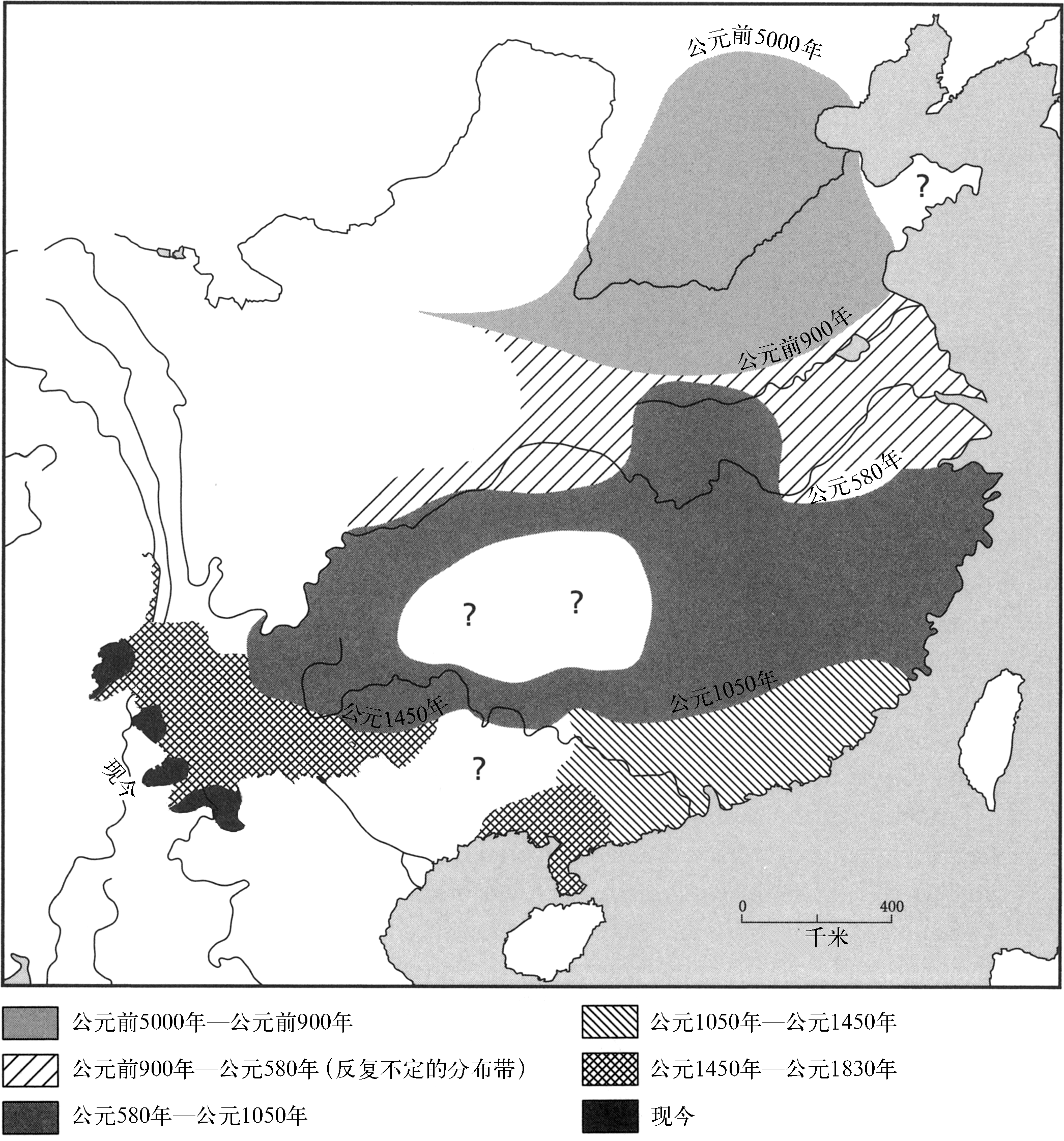 造成这一灾难(从大象的观点来看)的原因何在?部分原因可能在于气候变冷。大象不能很好地抵御寒冷。但是,既然在稍微暖和了些的时期(例如公元前700—前200年,当时它似乎从长江流域向北退回到淮河沿岸),大象种群恢复得也不多,并且多半根本没有恢复,那么,一定有其他的力量在起作用。最明显的解释即是,大象在与人类持久争战之后败下阵来。可以说,它们在时间和空间上退却的模式,反过来即是中国人定居的扩散与强化的反映。这表明,中国的农夫和大象无法共处。