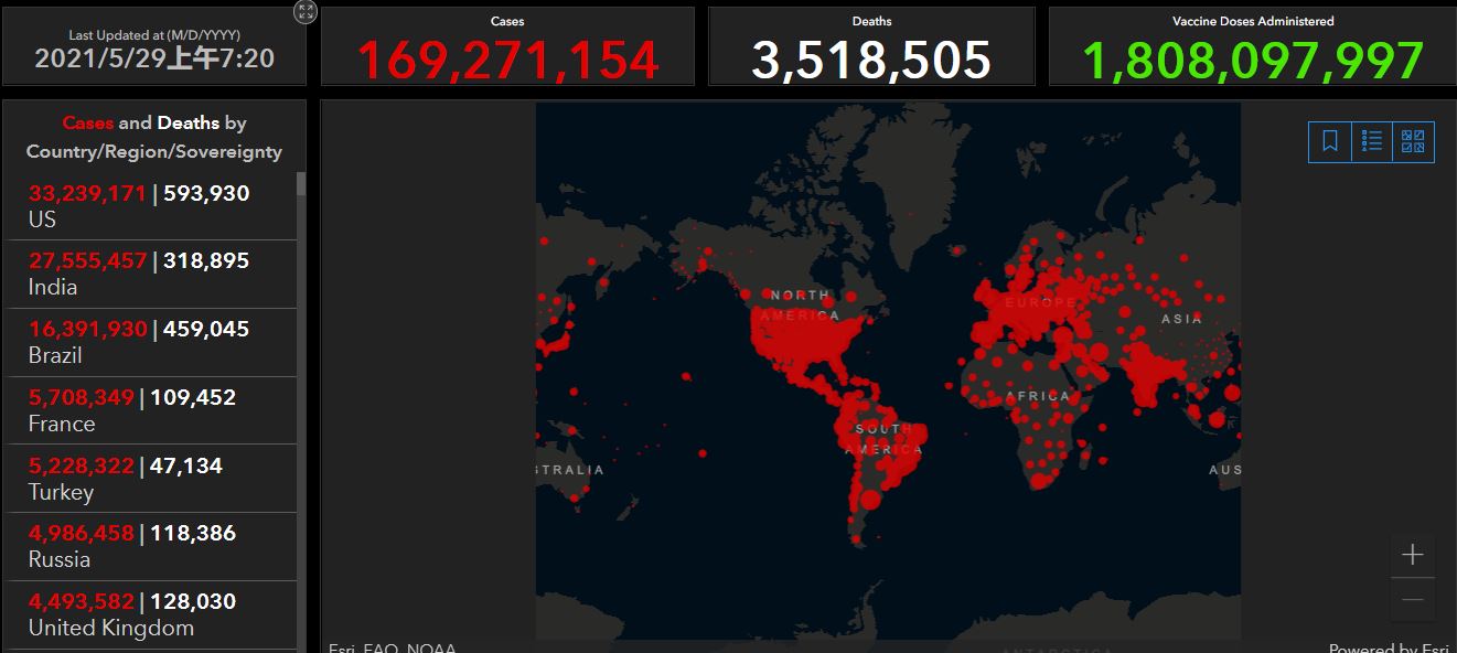 据约翰斯·霍普金斯大学的疫情追踪数据,截至北京时间5月29日上午8点30分,全球累计确诊新冠肺炎病例169271154例,累计死亡3518505例。