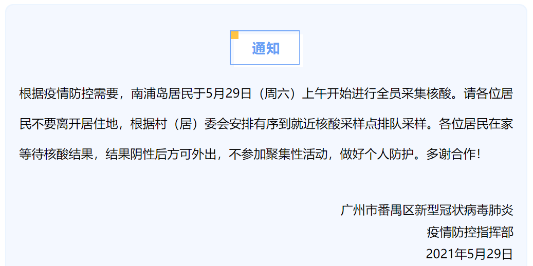 据“广州番禺发布”微信公众号消息,根据疫情防控需要,南浦岛居民于5月29日(周六)上午开始进行全员采集核酸。请各位居民不要离开居住地,根据村(居)委会安排有序到就近核酸采样点排队采样。各位居民在家等待核酸结果,结果阴性后方可外出,不参加聚集性活动,做好个人防护。