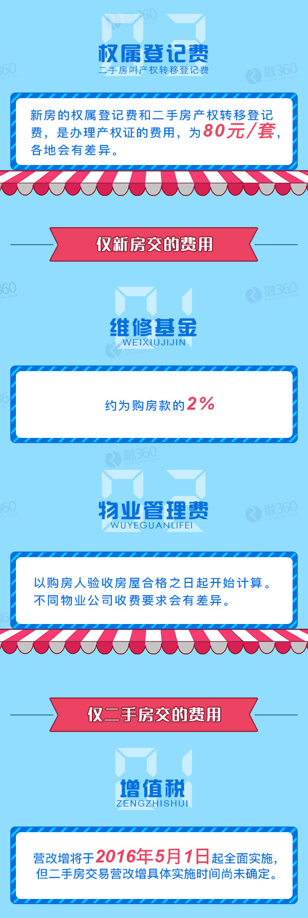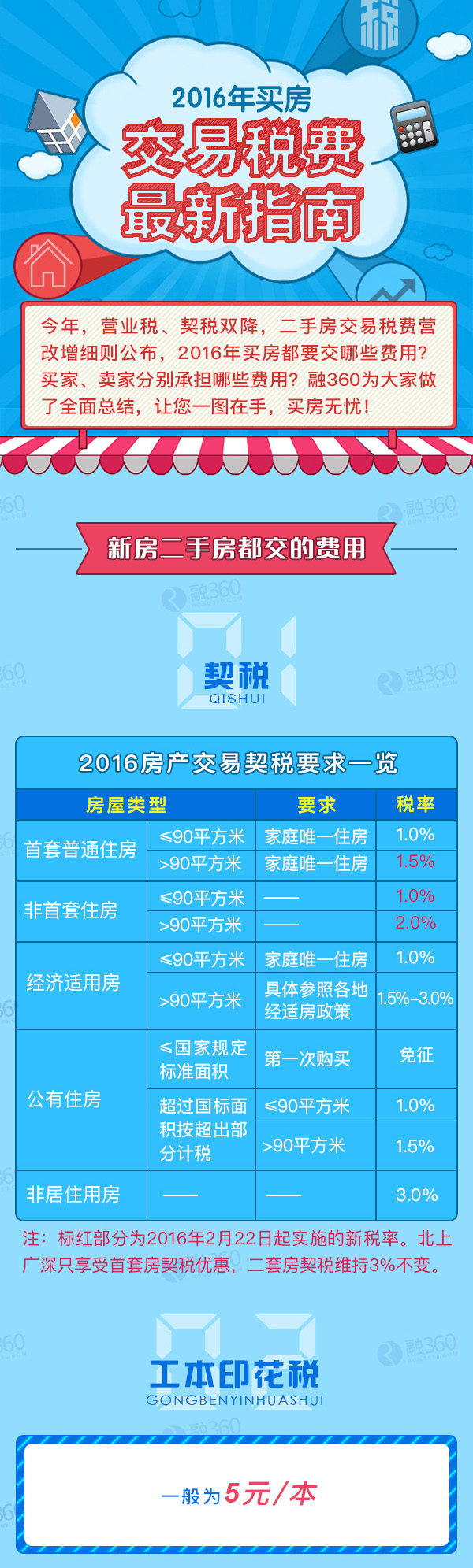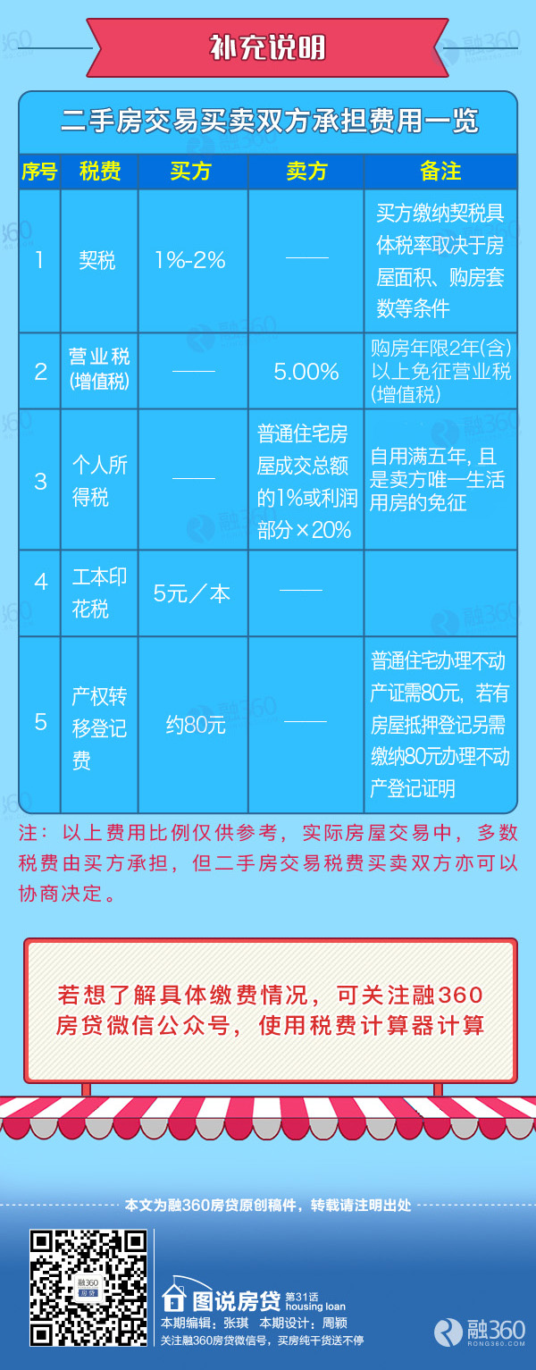 今年,营业税、契税双降,二手房交易税费营改增细则公布,2016年买房都要交哪些费用?买家、卖家分别承担哪些费用?融360为大家做了全面总结,让您一图在手,买房无忧!