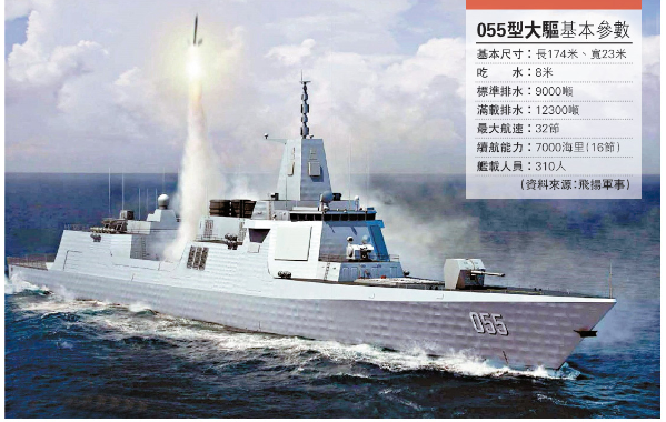 055型舰与DDG-1000战斗力相当。据公开资料报道,055型舰采用通用垂直发射系统,发射单元多达128个,可搭载96枚导弹,可发射防空、反潜、反舰导弹,也可发射陆攻巡航导弹。而美国《新美国人》网站刊文猜测,055型舰将拥有X波段和S波段雷达,防卫能力堪比美国宙斯盾巡洋舰。而DDG-1000则安装了新的垂直导弹发射系统,可以搭载80枚导弹,另外可安装电磁炮、激光武器,但DDG-1000在防御能力上较055型舰差。
