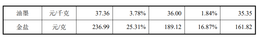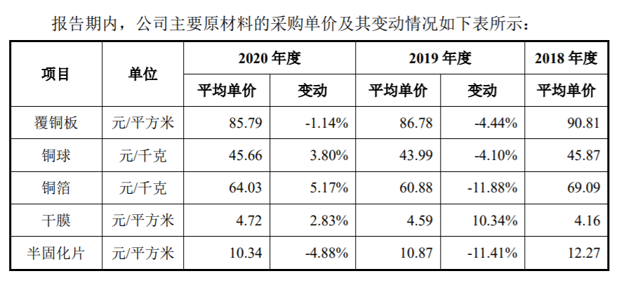 招股书显示,覆铜板是公司最主要的原材料,各年覆铜板采购金额占原材料采购总额的50%左右。报告期内,覆铜板采购均价分别下降4.44%和 1.14%;铜球、铜箔采购价格先降后升;金盐、干膜和油墨价格有所上涨,金盐上涨较快,油墨价格相对比较平稳。