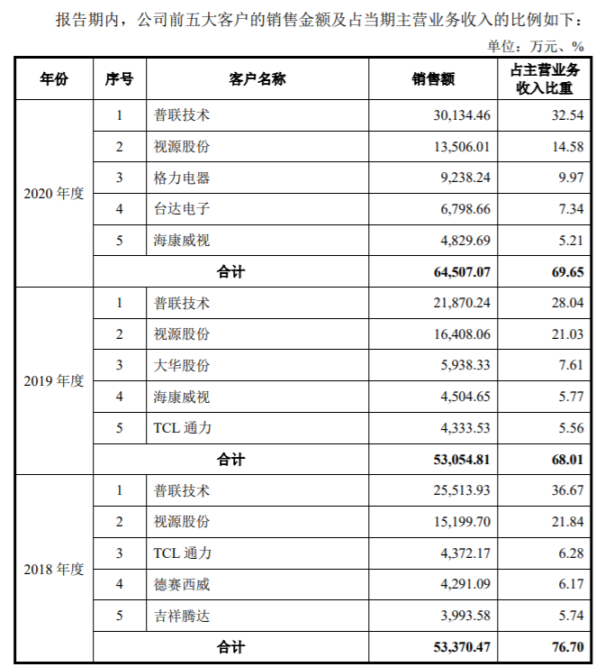 招股书显示,报告期内,公司前五大客户的销售收入分别为5.34亿元、5.31亿元和6.45亿元,占当期主营业务收入的比例分别为76.70%、68.01%和69.65%,总体呈现下降趋势,但客户集中度仍然较高。
