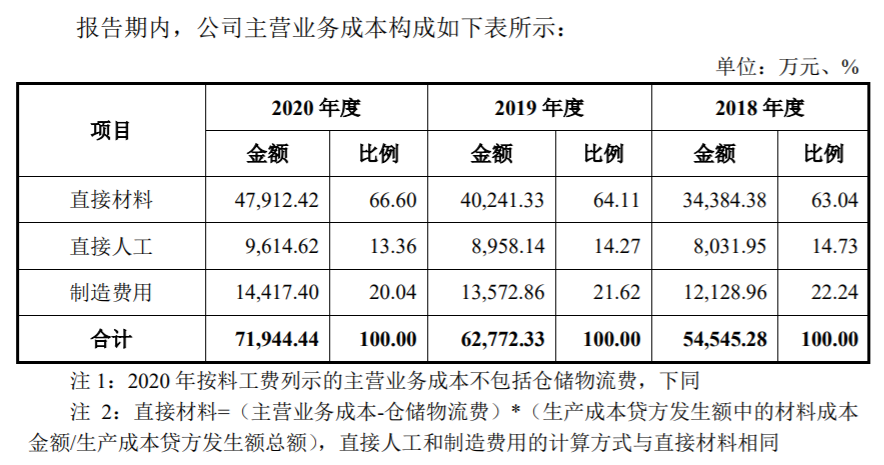 招股书显示,满坤科技主营业务成本分别为5.45亿元、6.28亿元和7.19亿元,其中直接材料占主营业务成本的比例较高,均超过60%,公司主要原材料包括覆铜板、铜球、铜箔、干膜、半固化片、油墨、金盐等。