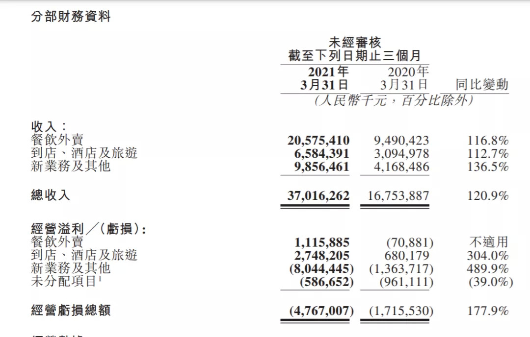 其中,餐饮外卖业务,交易金额同比增长99.6%至1427亿元,营收增长116.8%至206亿元,业务经营利润11亿元,去年同期亏损7090万元。到店、酒店及旅游业务,营收同比增长112.7%至66亿元,经营利润大增304%至27亿元;零售、B2B餐饮供应链以及共享骑行等新业务营收同比增长136.5%至99亿元。