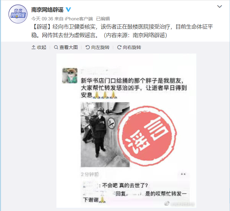 5月30日凌晨,@平安南京 通报,2021年5月29日晚,南京秦淮区金銮巷一嫌疑男子驾车撞人并持刀捅人。经初步调查,犯罪嫌疑人因感情纠纷行凶,犯罪嫌疑人、其前妻,以及其他6名受伤群众已送医治疗。央视新闻消息,犯罪嫌疑人被热心市民围堵,其中一身形较胖的热心男子,被嫌疑人用刀刺伤。据@南京网络辟谣 5月30日消息,经向市卫健委核实,该伤者正在鼓楼医院接受治疗,目前生命体征平稳。网传其去世为虚假谣言。