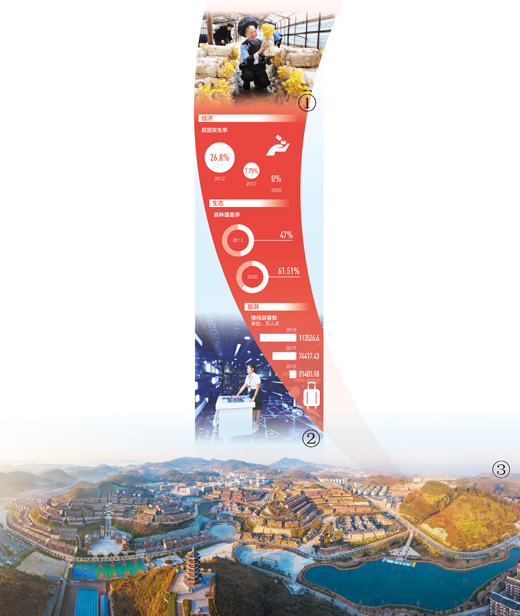 图①:贵州省黔西南布依族苗族自治州望谟县王母街道平绕村村民种植榆黄菇,一棚产值可达56万元。 谢 强摄(人民视觉) 图②:贵州大数据应用展示中心。 孙 琳摄(人民视觉) 图③:贵州省黔西南布依族苗族自治州晴隆县易地扶贫搬迁安置点阿妹戚托小镇全景。 林 民摄(人民视觉)