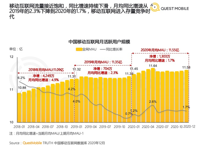 据《QuestMobile2020中国移动互联网年度大报告》,2020年全网月均MAU11.55亿,从年初的11.45 亿到12月的11.58 亿,净增1303万,月均增速只有1.7%。