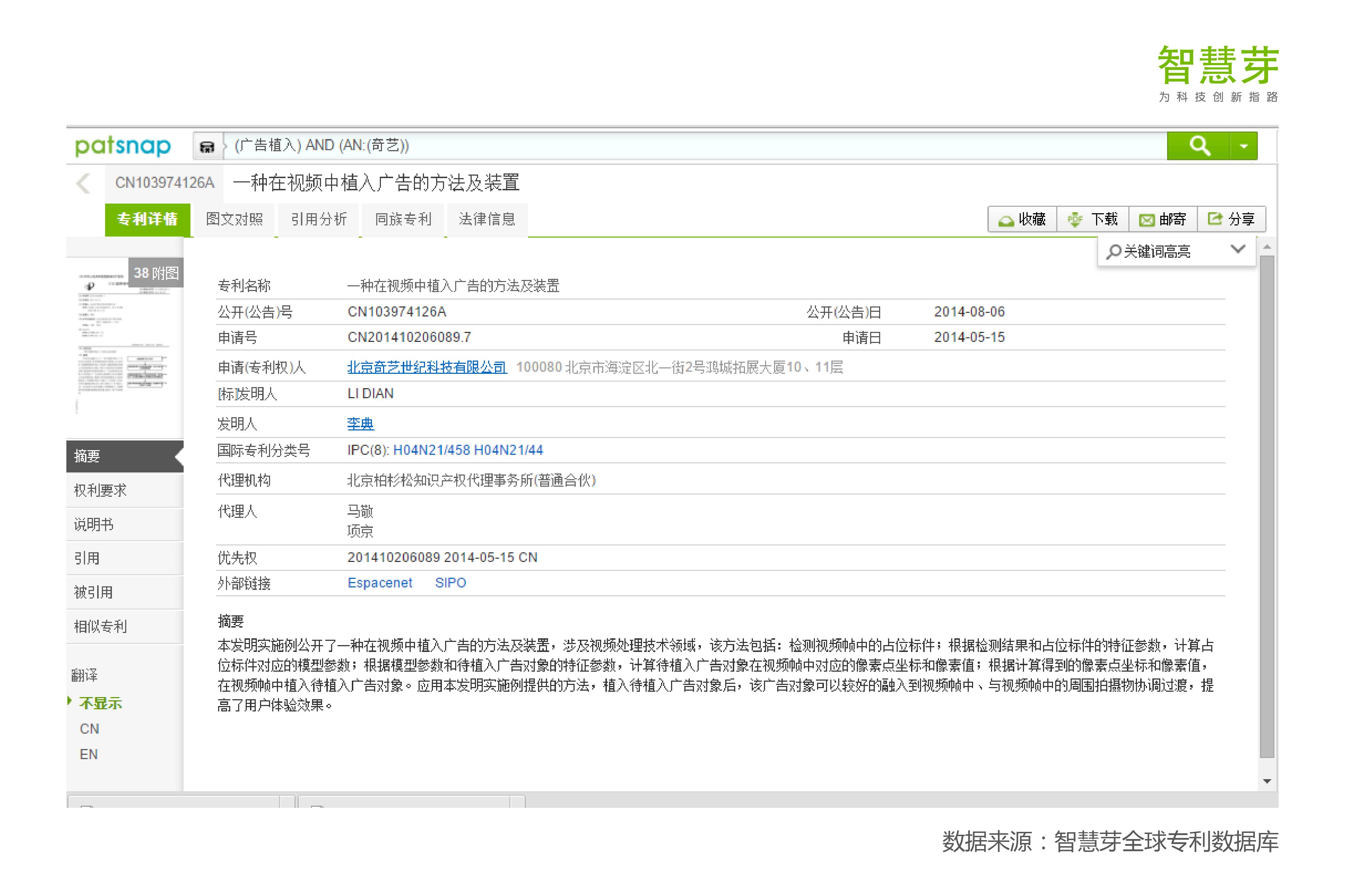 2014年5月,爱奇艺就申请了一项专利CN103974126A,一种在视频中植入广告的方法及装置。通过这项专利,将彻底改变植入广告的时间困境,无论内容播出多久,都能够让食品、汽车、服装、珠宝等商品成为剧中新元素,同时使得植入广告售卖周期和内容生命周期等长,极大拓展植入营销空间。正是因为重要,奇艺随后围绕这个主题申请了一系列衍生专利,无独有偶的是这一系列专利都要求了提前公开(申请后3个月左右),目前都处于实审阶段。