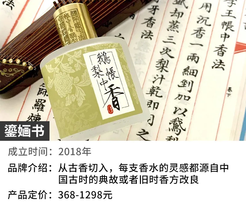 除了日常场景,还有品牌会从古代文化入手。鎏婳书从古香切入,据称推出的每一款香水都有史可查,明星单品鹅梨帐中香是宋朝最为流行的香,又名“江南李主帐中香”,是南唐李煜为妻子小周后所制,因为太过流行,配方一直没有失传。