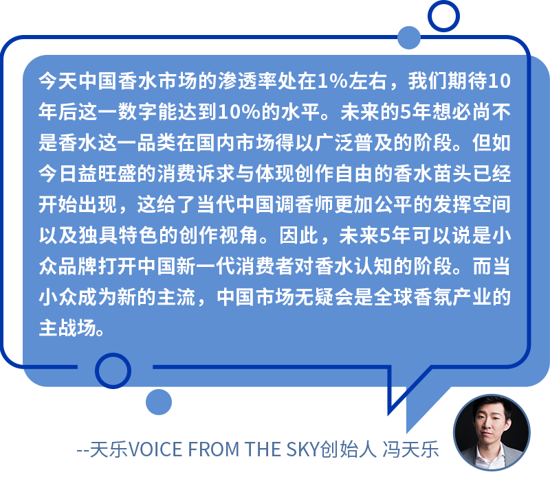 在天乐看来,今天中国香水市场的发展正在从2.0过渡到3.0时代,整体处于方兴未艾、但已开始高速增长的阶段。扭转国内香水行业局面的突破口是文化自信,一众新锐香水品牌已经迎来了新的机遇。