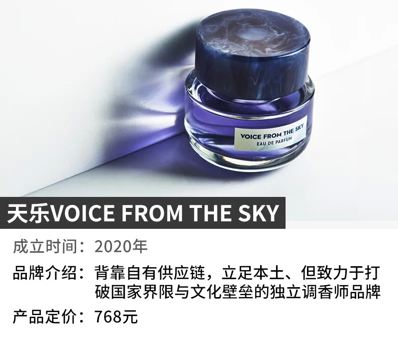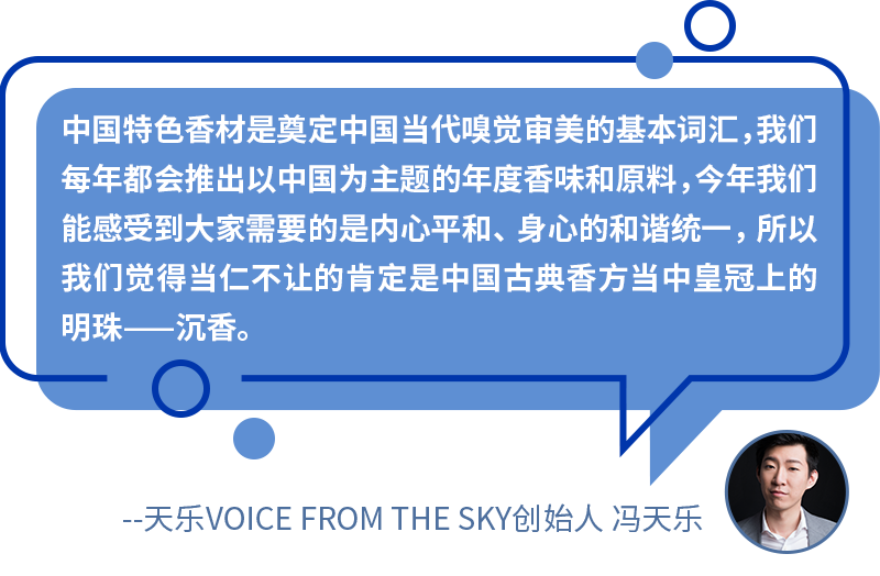 除了用中国文化打造香水故事,还有品牌善于挖掘中国古典香原料。独立调香师品牌天乐VOICE FROM THE SKY的同名香水天空之声中就添加了中国古典香方中的原料海南沉香。