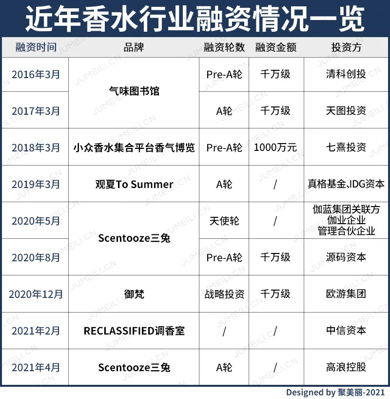 据不完全统计,以下是近几年香水行业的融资情况,可以看到20年之后香水品牌融资案例明显增加。