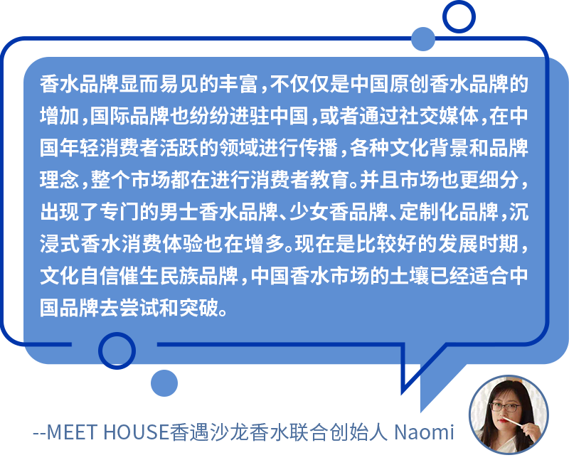 “香水作为近两年比较热的赛道,得到了广泛的关注,意味着这个品类在中国本土所能获得的资源也会越来越多,意味着我们现在遇到的问题,有更多元的力量来共同解决,我个人认为国货香水品类还是在启动期,对于品牌来说情况各不相同,有自己需要突破的内容,但对于整体来说,短期内还谈不到行业瓶颈问题。”Naomi说道。