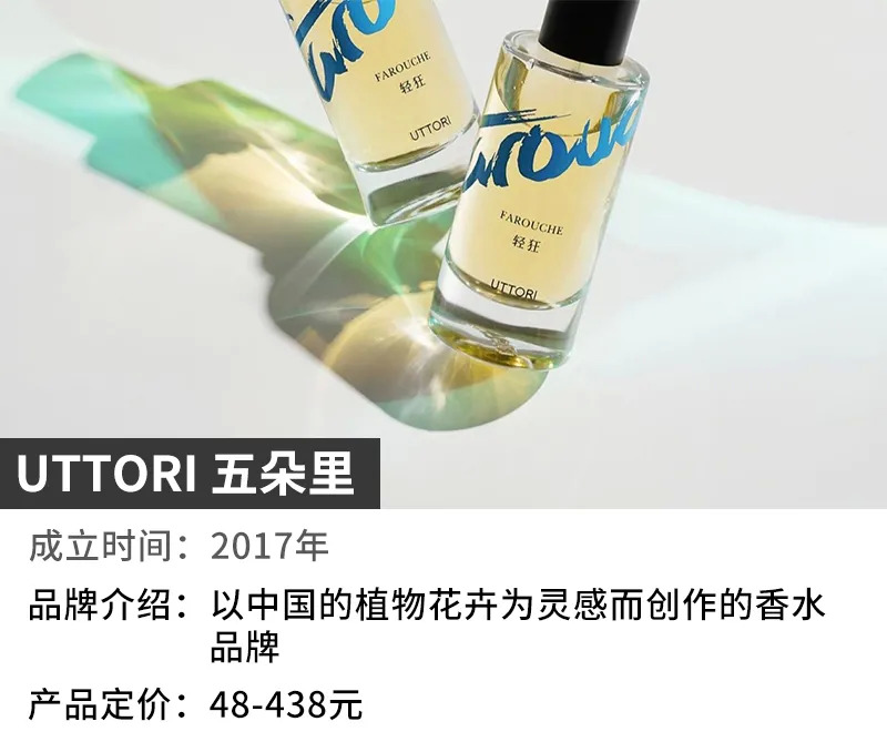 UTTORI五朵里在同样结合了桂、梅、兰等代表性花卉之外,还推出了更有中式意蕴的纸墨香气,以及以风、光这样比较抽象元素的香气。