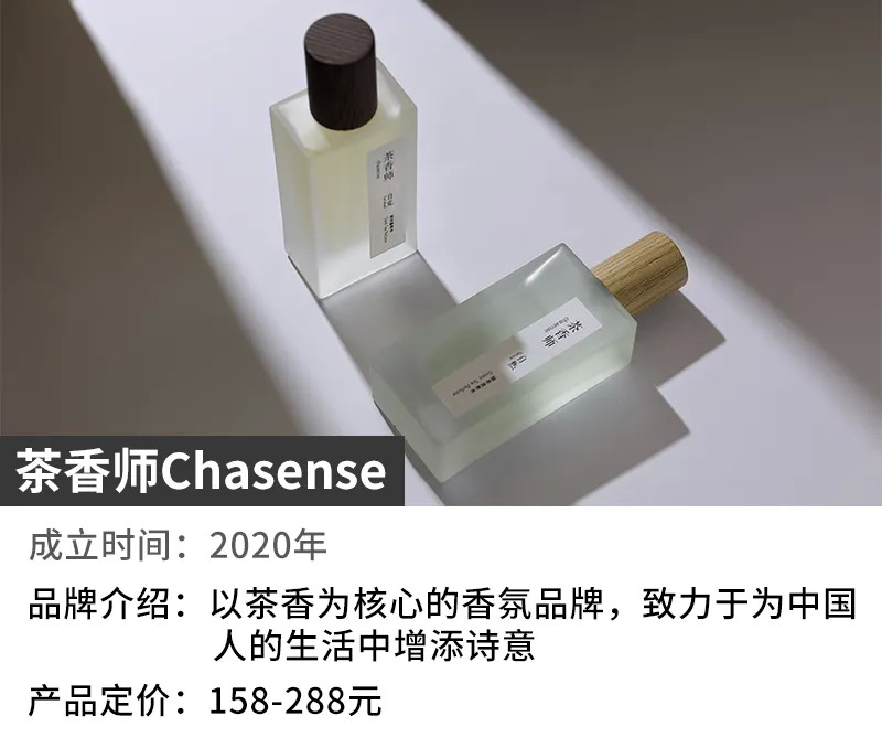 另一品牌茶香师Chasense 正如其名,理念是“以茶为师,心浸自然”。品牌香水主要的意境茶香系列是以六大茶系为引导创作的,目前已出四款:自然绿茶、自觉黑茶、自信红茶、自得乌龙。