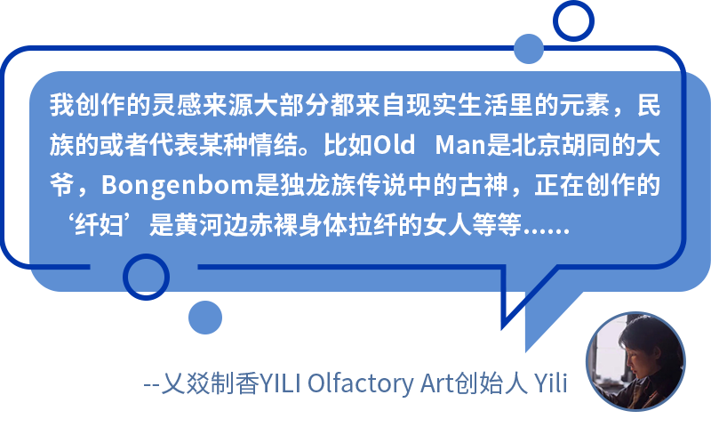 以Bongenbom伏羲举例,这是一款以独龙族文化为灵感设计的香水,团队甚至亲赴云南省独龙江乡采集野生香料植物,为香水创作汲取素材。在创作Bongenbom伏羲这支香水时,Yili想要传达神话中男性英雄阳性、刚直的气质与贴近自然的力量,因此在创作中选取了胡椒、公丁香和肉豆蔻作为前调,在短暂的辛辣之后,是日本桧木、焚香、愈创木等香料组成的木质香中尾调。