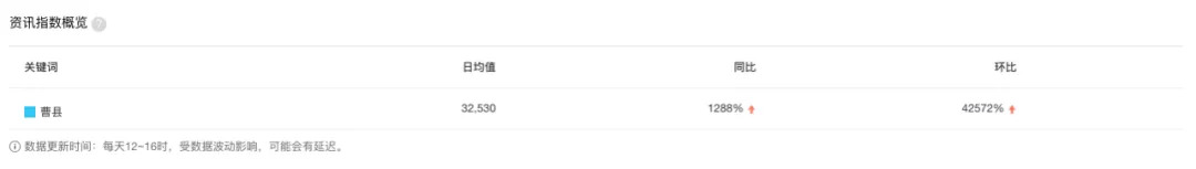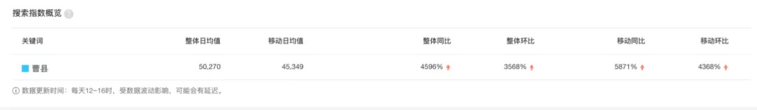 据百度指数显示,近一个月内,“曹县”关键词整体日均搜索指数50270,整体同比增长4596%,环比增长3569%;日均资讯值32530,同比增长1288%,环比增长42572%。