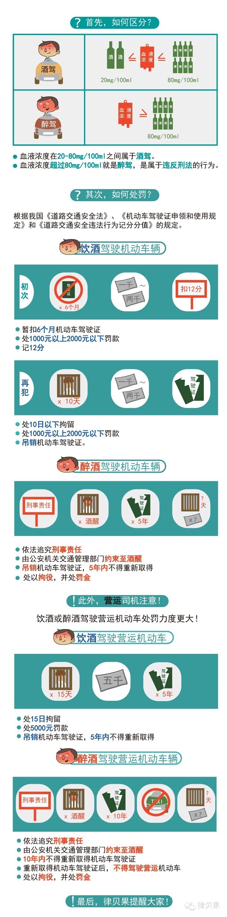 酒后驾驶分为饮酒驾驶和醉酒驾驶。饮酒驾驶一般只会处以行政处罚,但如果是醉酒驾驶,那么问题就严重了,涉嫌危险驾驶罪,是违反刑法的!!律贝果,一张图让你看清酒驾和醉驾。
