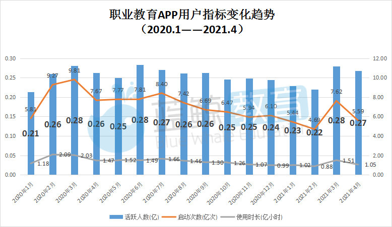 从上图可以看出,在线职业教育赛道在2020年的表现较为起伏,但与中小学教育、教育平台等赛道相比,职业教育赛道的用户规模变化略显平缓。该赛道的活跃人数在2021年经历了1月和2月的连续下跌后,在3月出现大幅回升,环比增幅高达27.7%,但在4月再次回落。2021年4月末活跃用户0.24亿次,使用时长和启动次数较2021年3月末出现较为明显的下跌,使用时长环比下降30%,启动次数环比下跌27%。