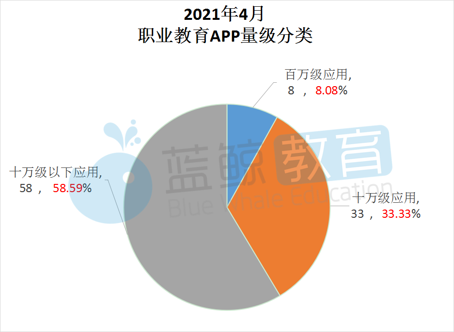 下面,蓝鲸教育智库把99家职业教育APP,按照用户规模,分别以1亿、1000万、100万、10万为界限做量级分类,职业教育领域最高用户规模为百万级应用,得到的结果如下图所示: