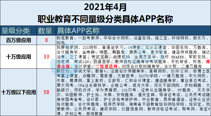 从该榜可以看出,百万级应用没有发生变化;十万量级新增的两家应用分别是:“博傲金题”和“二级建造师”(上图已标红);“幼师宝典”(图中标灰的APP)则从十万量级跌出,成为十万级以下应用。