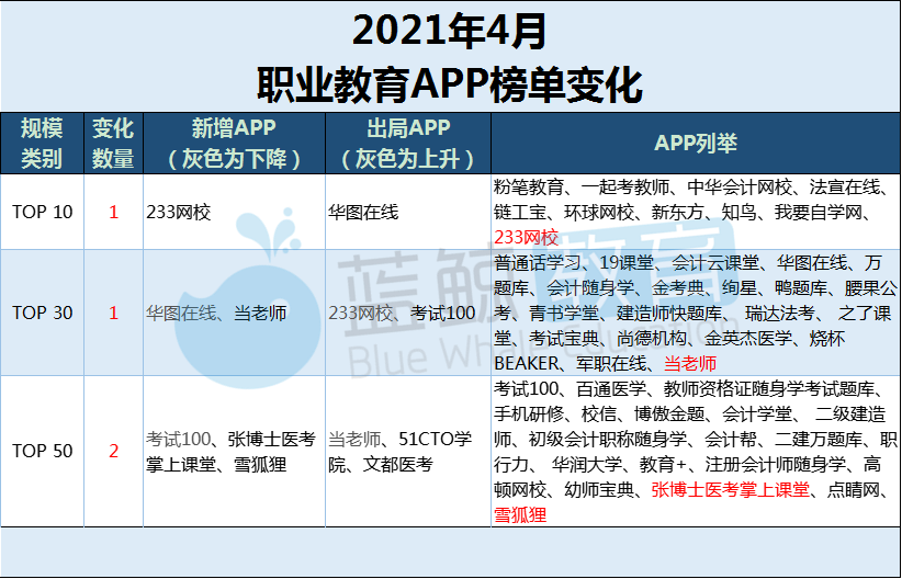 为了更好的梳理2021年4月末职业教育学习赛道具体的APP数据变化,蓝鲸教育智库选取了2021年3月末到2021年4月末,职业教育APP的具体榜单变化,下图是2021年4月职业教育APP榜单变化:标灰色的APP表示从上一级别甩出到下一级别或者从下一级别进入上一级别,并不算作该级别新增APP;标红的为2021年4月各大TOP排行榜等级上升的APP: