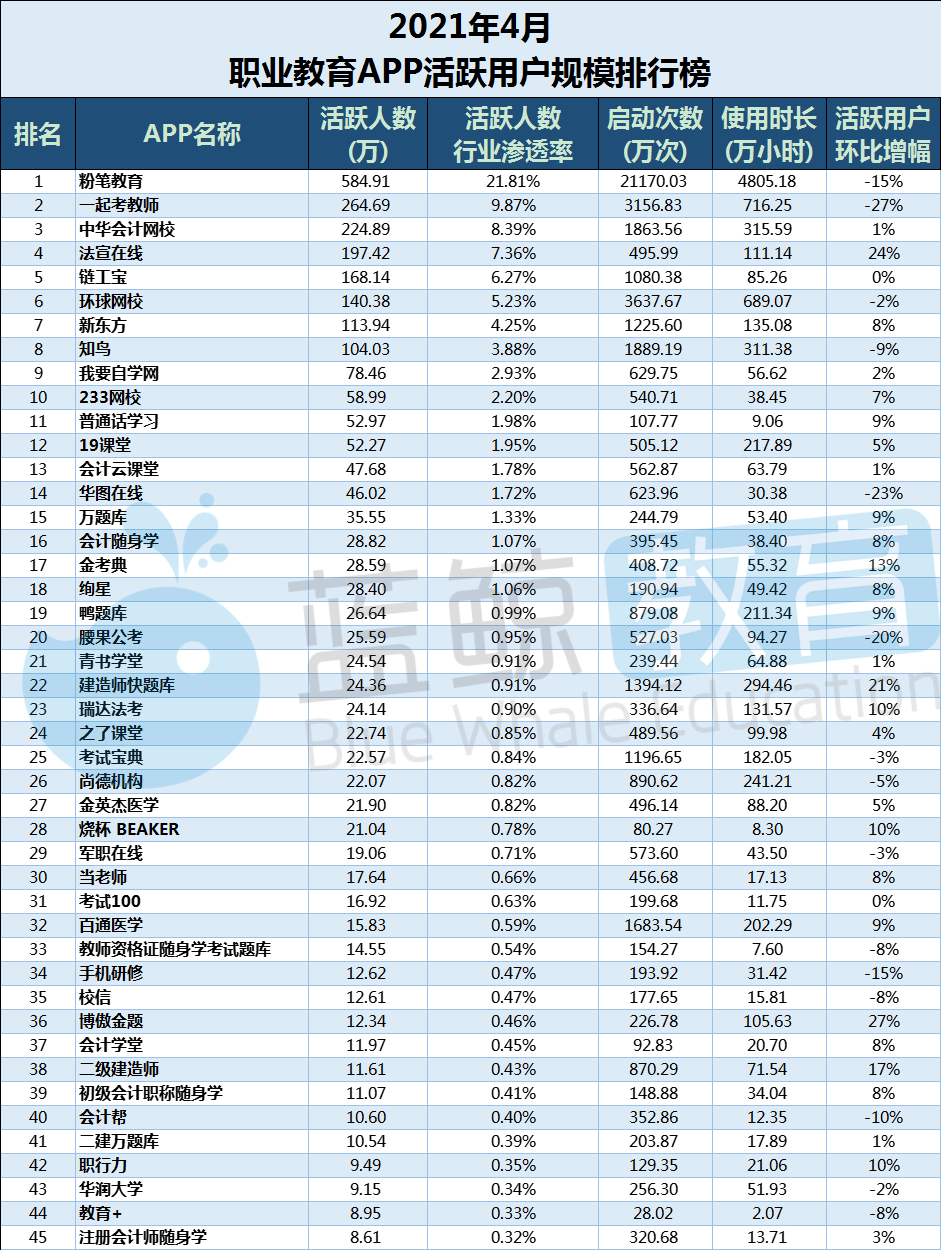 综合以上分析维度,4月份职业教育赛道各数据均有回落,其中使用时长与启动次数出现明显下跌,使用时长环比降幅为30%,启动次数环比下降27%。2021年4月份职业教育赛道靠近头部的企业,活跃用户规模位次相对固定,并且各级别规模APP数量与领域渗透率相对固定。