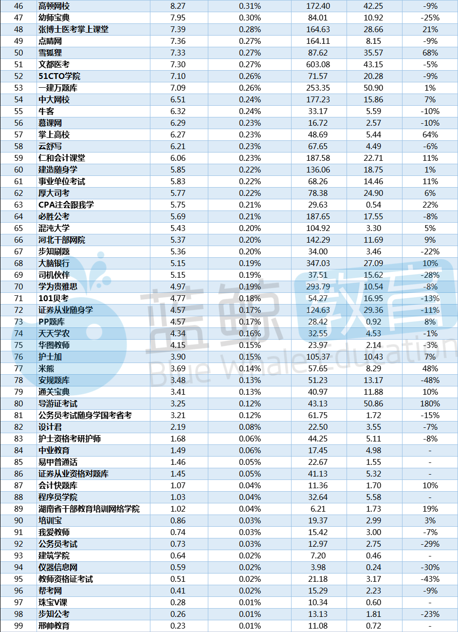与去年同期数据相比较,TOP 10的APP有一半出现上涨,有4款APP用户规模同比增长为负,这四家应用分别是:“一起考教师”“法宣在线”“知鸟”“我要自学网”,同比增幅最高的APP是“新东方”,同比增幅为47%,降幅最高的是“知鸟”,同比降幅达50%。