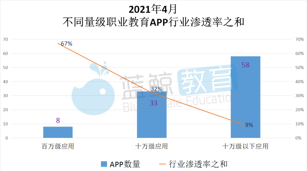 8家百万级应用:“粉笔教育”“一起考教师”“中华会计网校”“法宣在线”“链工宝”“环球网校”“新东方”“知鸟”,它们的用户渗透率为67%;33个十万级用户规模APP,用户渗透率达32%,不及8家百万级应用的渗透率;十万级以下应用数量最多,领域渗透率之和最低,58家APP的领域渗透率之和仅9%。