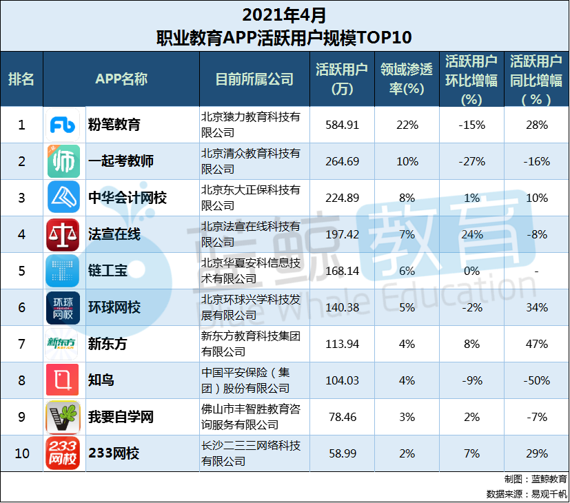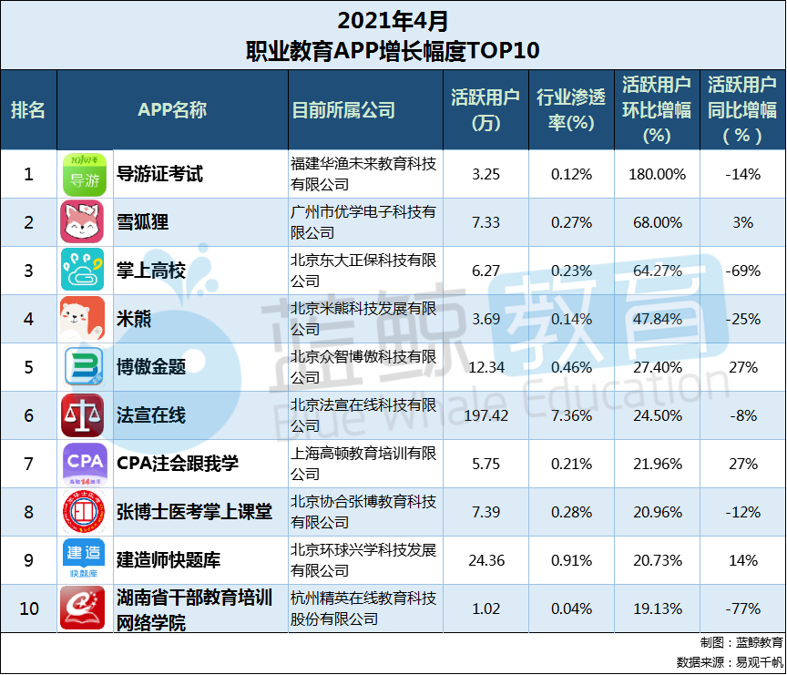 我们再来看看,职业教育领域用户增长幅度TOP 10的APP,2021年4月末活跃用户环比增幅TOP 10榜单如下(个别APP无2020年同期数据,故标为“-”):