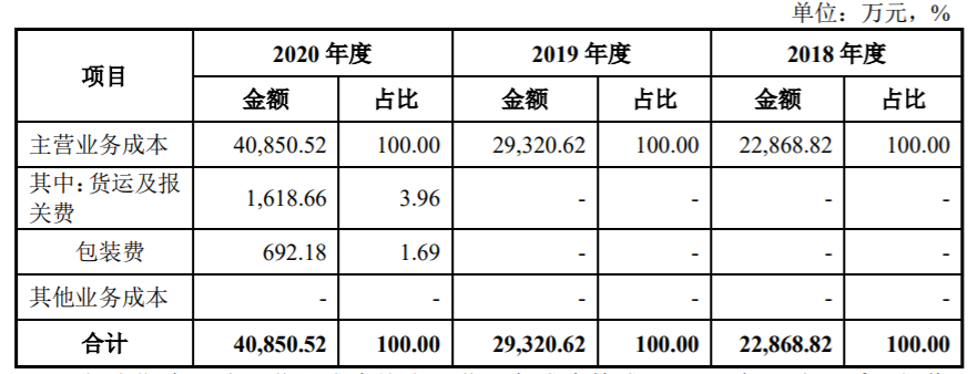 招股书显示,绿通科技的营业成本均由主营业务成本构成,其中自2020年1月1日执行新收入准则,公司将当期发生的货运及报关费和包装费(原计入销售费用)等合计2310.83万元作为履约成本计入营业成本。