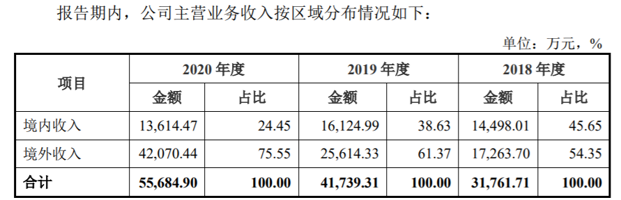 报告期内,绿通科技境外收入分别为1.73亿元、2.56亿元和4.21亿元,占主营业务收入比例从2018年的54.35%快速上升到2020年的75.55%,公司境外收入呈现大幅上涨趋势且占比较高。