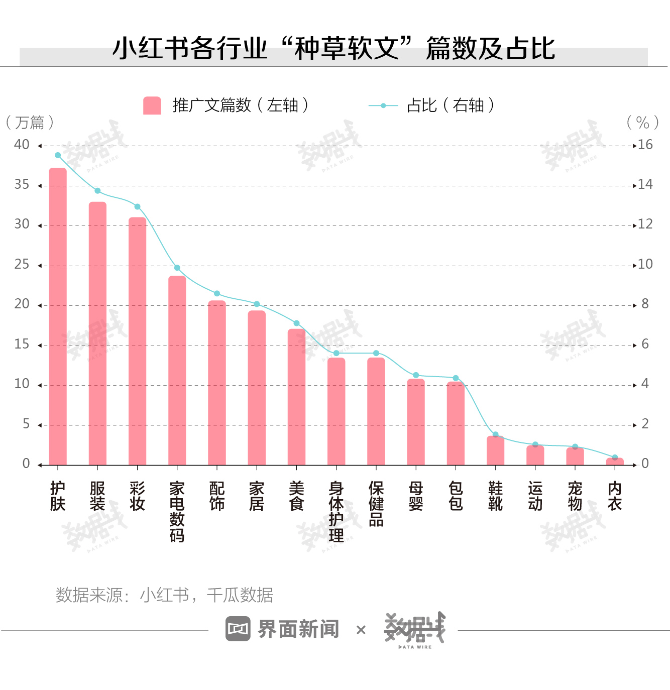 从小红书各行业“种草软文”投放量来看,护肤、服装和彩妆占据小红书前三。喜欢在小红书投放“种草软文”的行业,基本都是女性关注的。