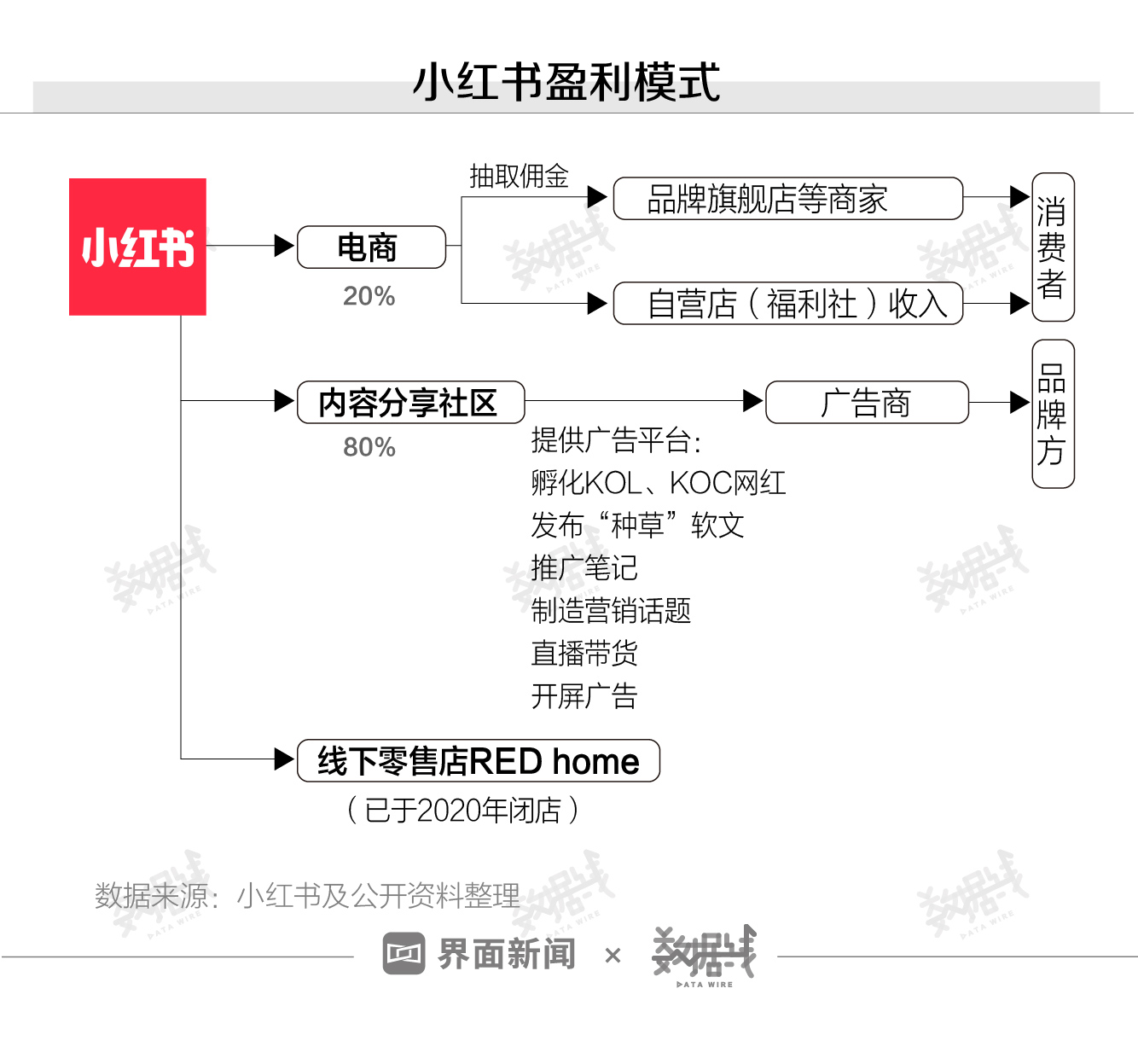 目前,小红书的主要盈利模式为电商(约占20%)及内容社区中的广告营收(约占80%)。