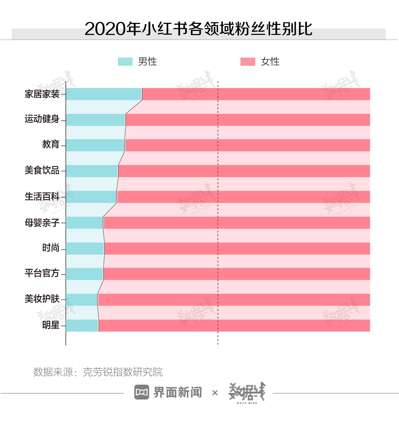 小红书各领域女性粉丝都高于男性。男性用户最关注的是家居家装、运动和教育领域。虽然男性用户占比都没过半,但增长较快。2020年,小红书的美食领域中男性用户同比增长254%。