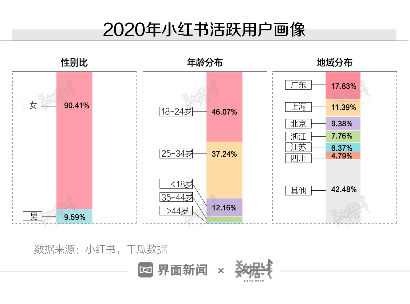 谁最爱用小红书?从年龄分布来看,34岁以下的群体占比超95%。18到24岁的用户占比近一半,未成年活跃用户也超1成。虽然与B站同属年轻人的内容社区,但小红书明显偏向女性群体,活跃用户里面超9成都是女性,而且在广东、上海、北京、浙江等沿海发达省市的最多。