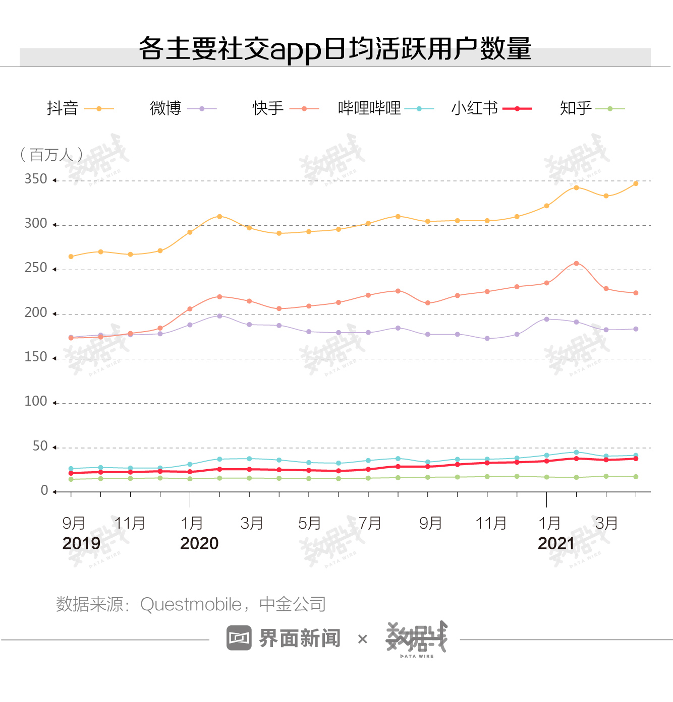 小红书日活量在主要社交app中排名第五,一直与B站非常接近。抖音日活量第一,平均每天近3.5亿用户使用,是小红书的7倍以上。
