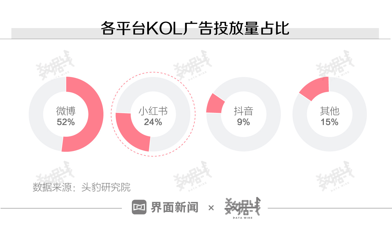 小红书的广告投放量占24%,仅次于微博,是抖音的近3倍。