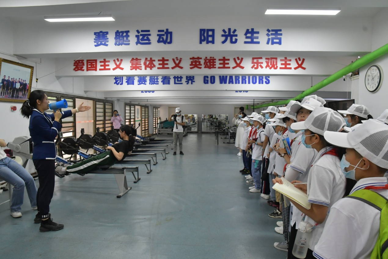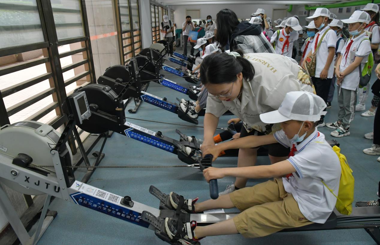 在西安交通大学,大家参观了学生赛艇俱乐部。在赛艇队队员的指导下,学生们体验了代替水上训练的专业设备测功仪。学生们在四大发明广场,听着学生志愿者的讲述,领悟到西安交大人对于伟大先辈们“饮水思源”的感恩之情,并在钱学森图书馆前合影留念。