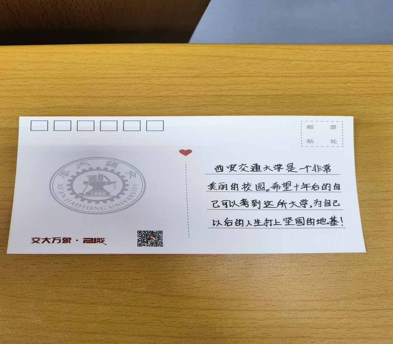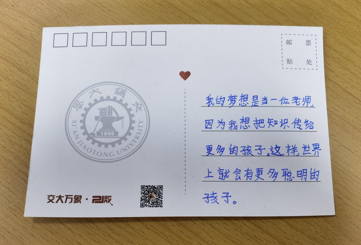 来自渭南澄城县的交大学子翟晗作了《清风迎面走来,成就我的交大梦》的演讲,她讲述了自己的求学经历并与大家分享了学习方法和经验。演讲结束后,学生们在明信片上写下并分享自己对于西安交大的参观感受以及对于未来的美好憧憬。