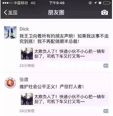 事件起源于17日下午爆出的一段事件现场视频,引发网友愤怒。而顺丰集团总裁王卫第一时间在朋友圈转发《太欺负人了!快递小伙不小心把一辆车刮了,司机下车又打又骂~》文章并撂话:“如果我这事不追究到底!我不再配做顺丰总裁!”,力挺快递小哥,受到网友大赞。